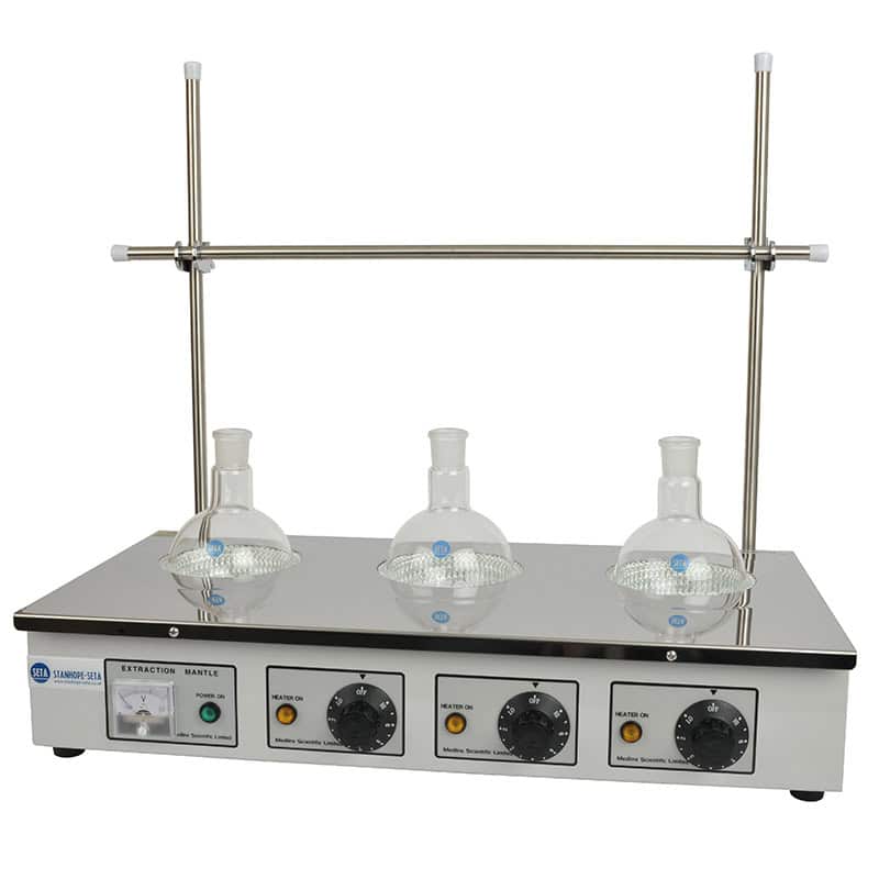 Seta Distilasyon Şişesi Isıtıcısı, üç adede kadar 500 ml şişeyi (cam malzemeler ayrı satılır) alabilecek kapasiteye sahip, ayarlı bir ısıtma mantelidir. Hassas sıcaklık kontrolü gerektiren laboratuvar prosedürleri için tasarlanmış genel amaçlı bir ısıtma mantelidir.