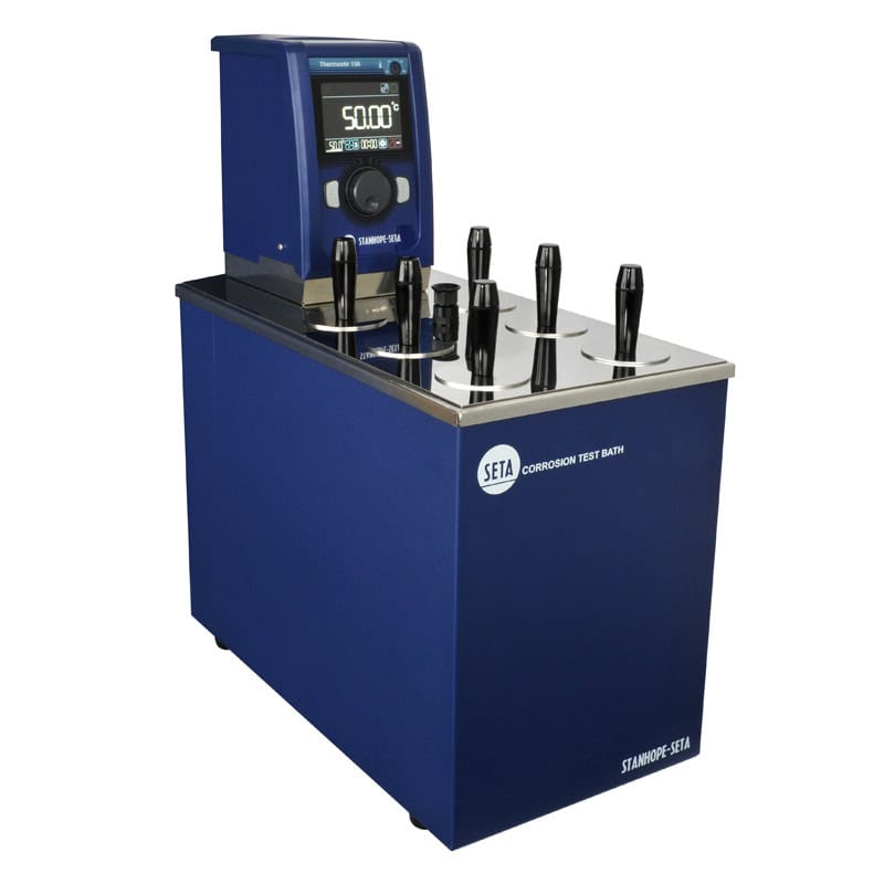 Seta Gümüş ve Bakır Korozyon Banyosu, tezgah üstü, paslanmaz çelik su veya yağ banyosudur. Ortam sıcaklığı +5°C ila 150°C aralığında 0,1°C’ye kadar dijital olarak kontrol edilen banyo, yakıtların, yağlayıcıların ve diğer hidrokarbon ürünlerinin bakır ve gümüş üzerindeki korozif etkilerini belirlemek için kullanılır.